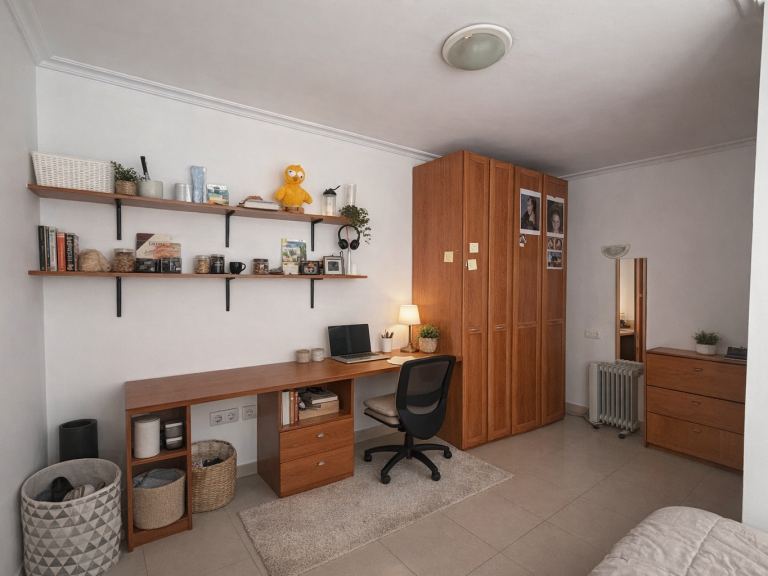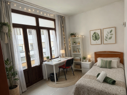 Totalmente amueblada, con todo lo que puedas necesitar, podremos hacerla a tu gusto, no todos necesitan el mismo mobiliario, cuéntanos tu idea y te ayudaremos a tener la habitación a tu gusto